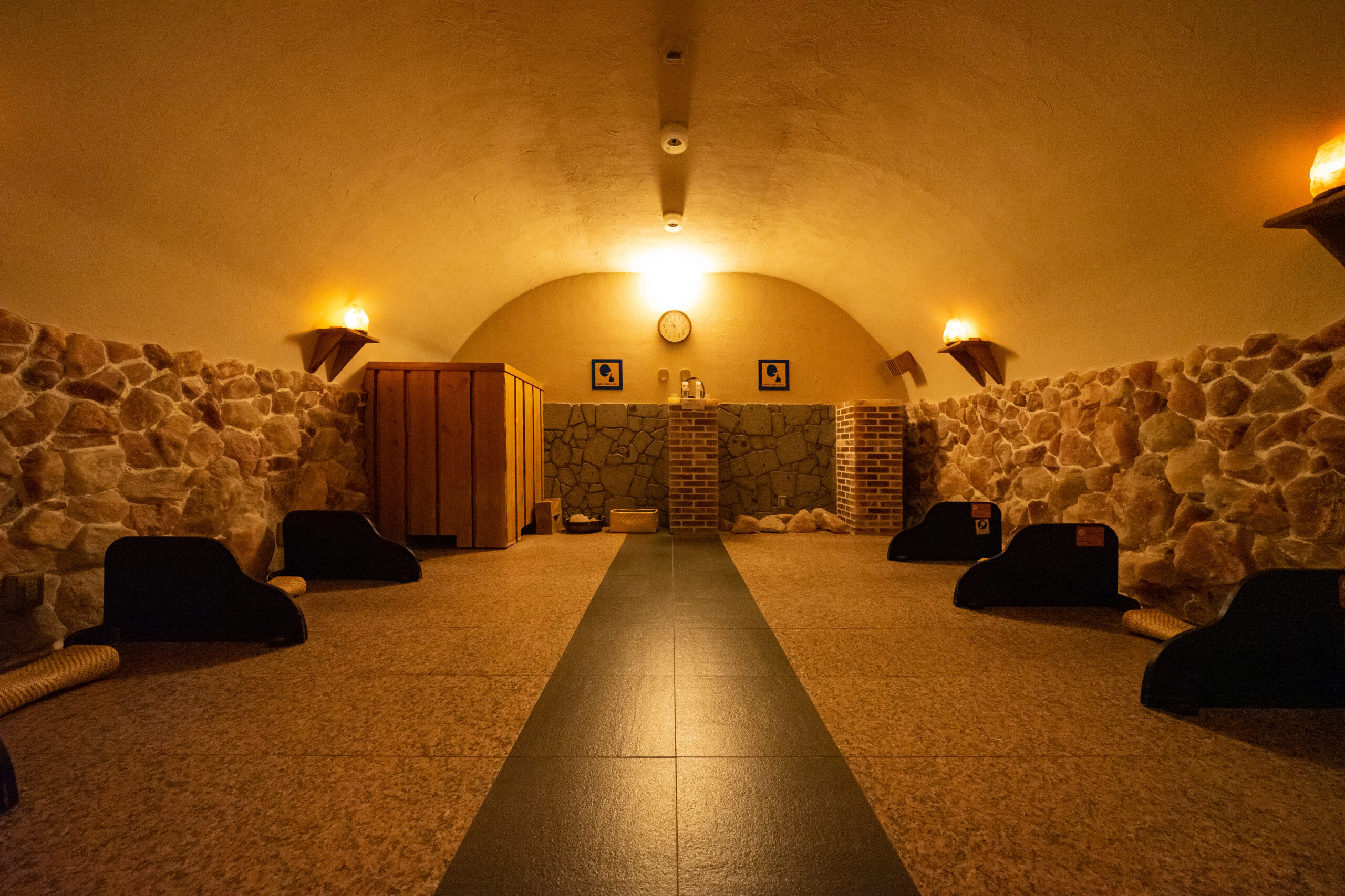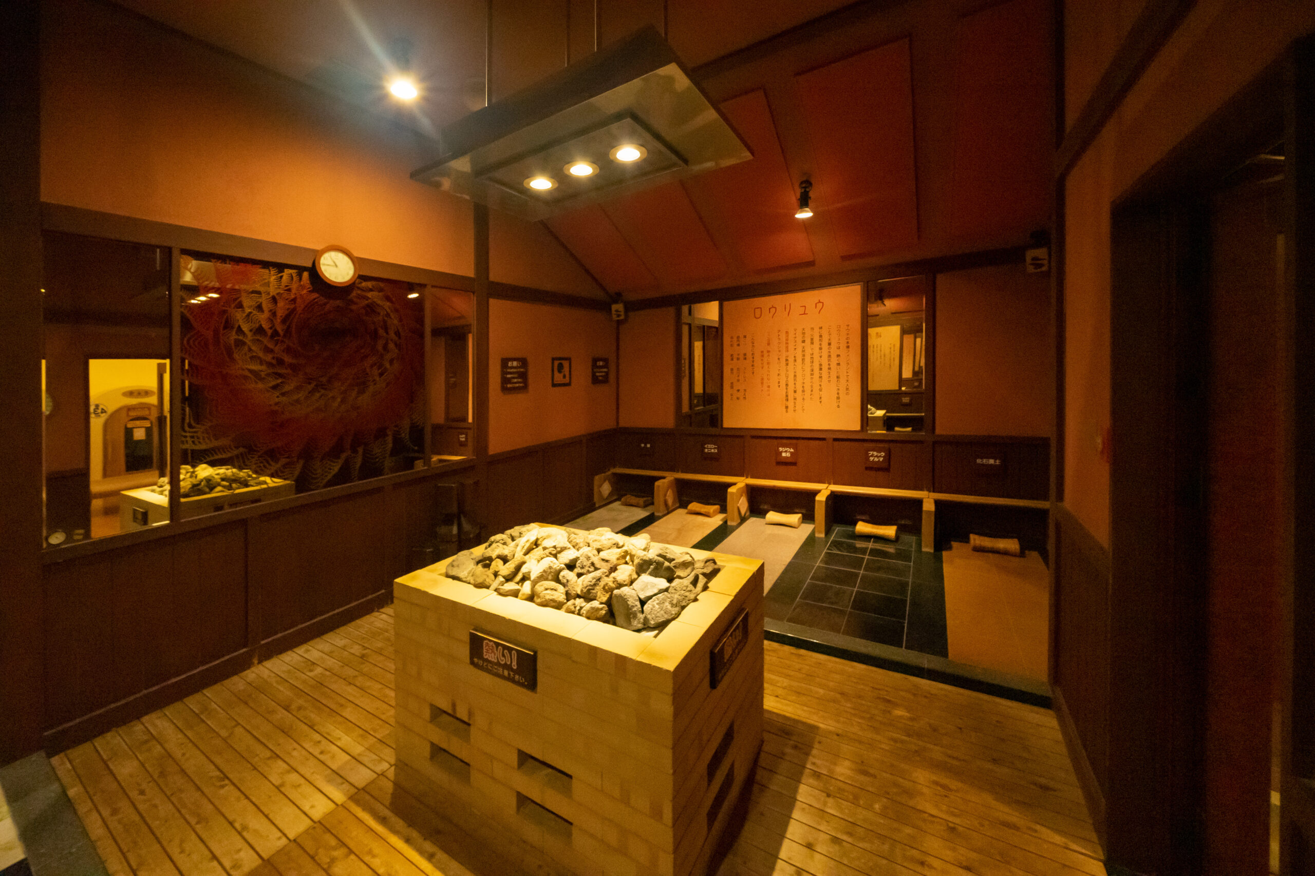 中央の火窯には天然溶岩石をふんだんに使用し、床には5種の薬石を敷き詰めています。大量の遠赤外線で体をじっくり温め、室温60℃の環境でしっかり発汗が楽しめます。