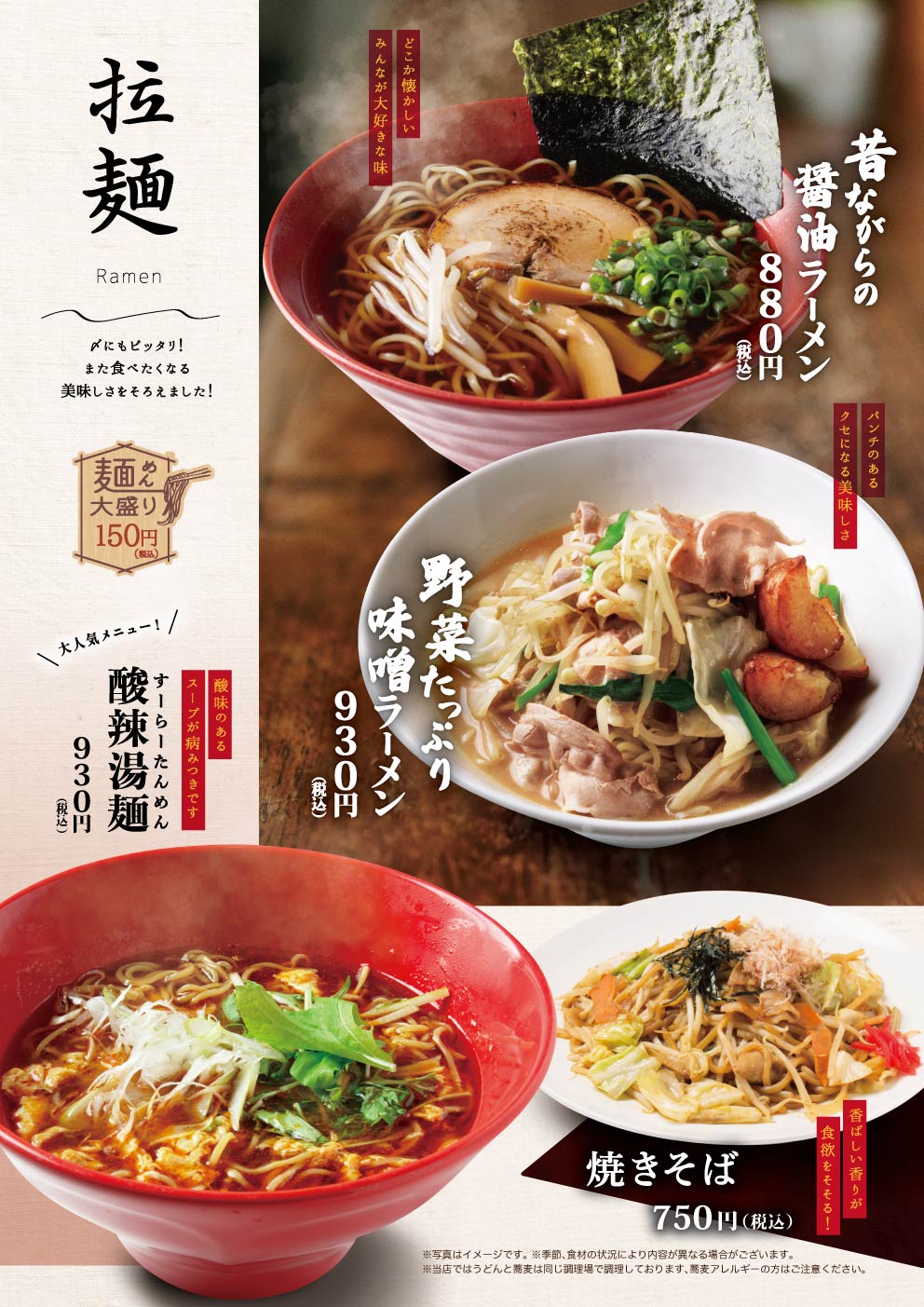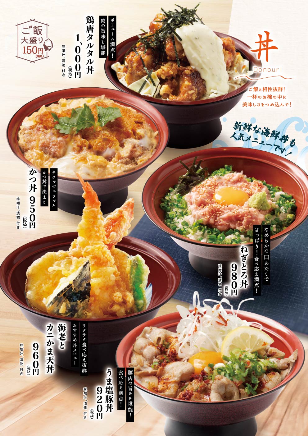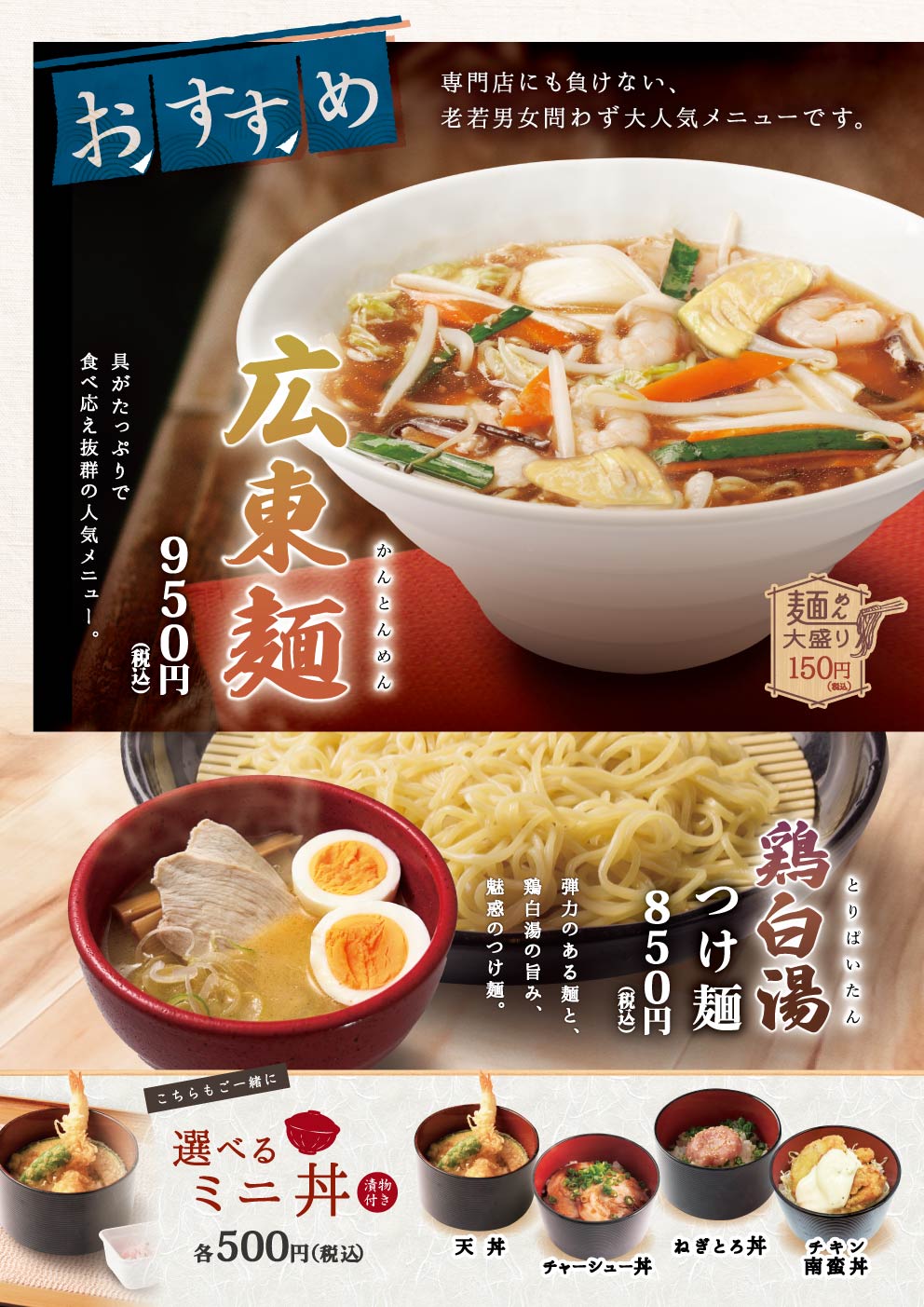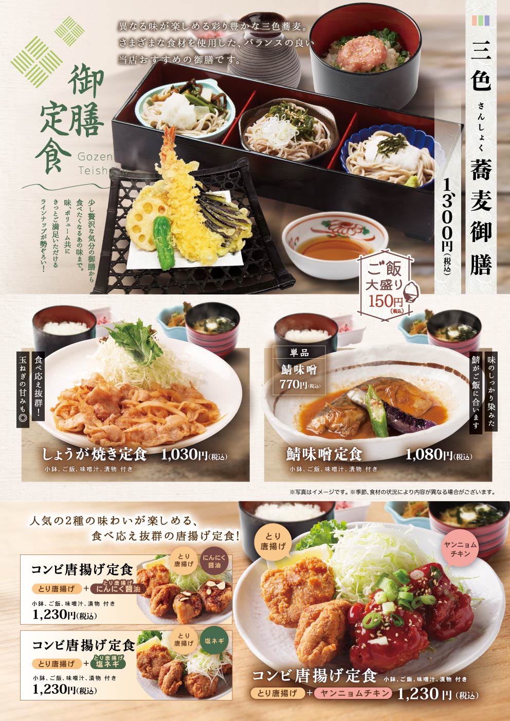 定食や丼物、麺類から軽食まで、幅広い世代にお楽しみいただけるラインナップです。